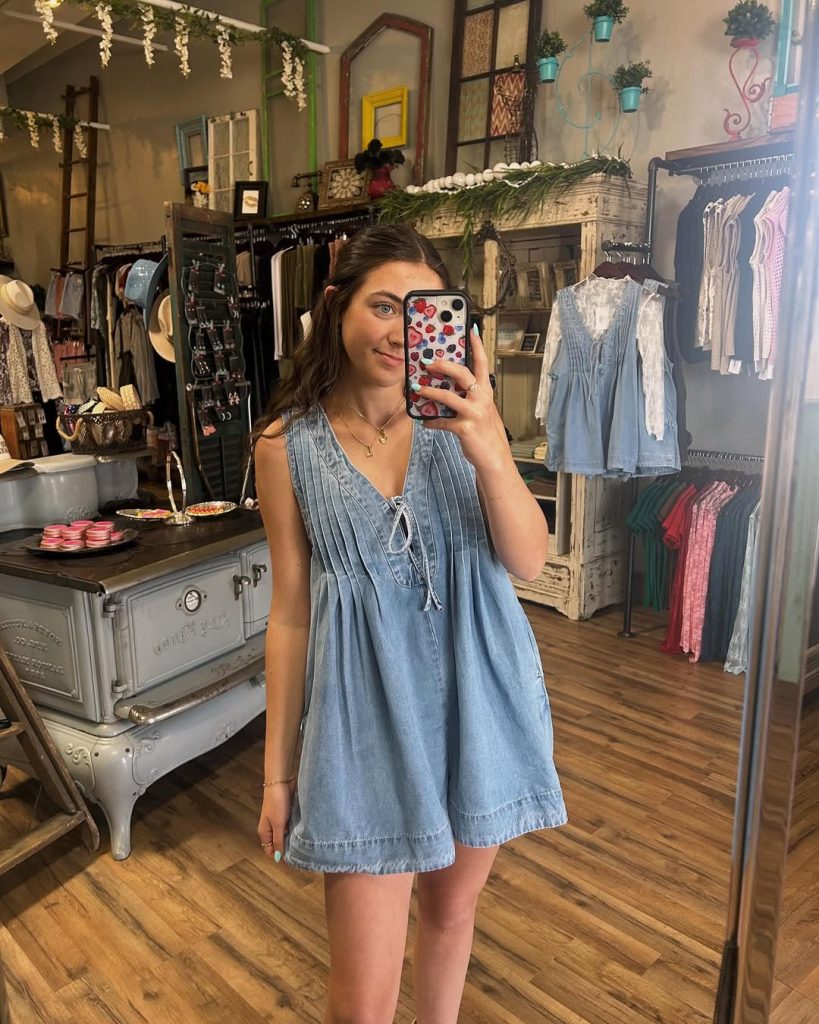 A soft denim babydoll dress captures effortless cute charm and relaxed casual style, making it a perfect summer concert outfit for 2026 for warm outdoor shows.