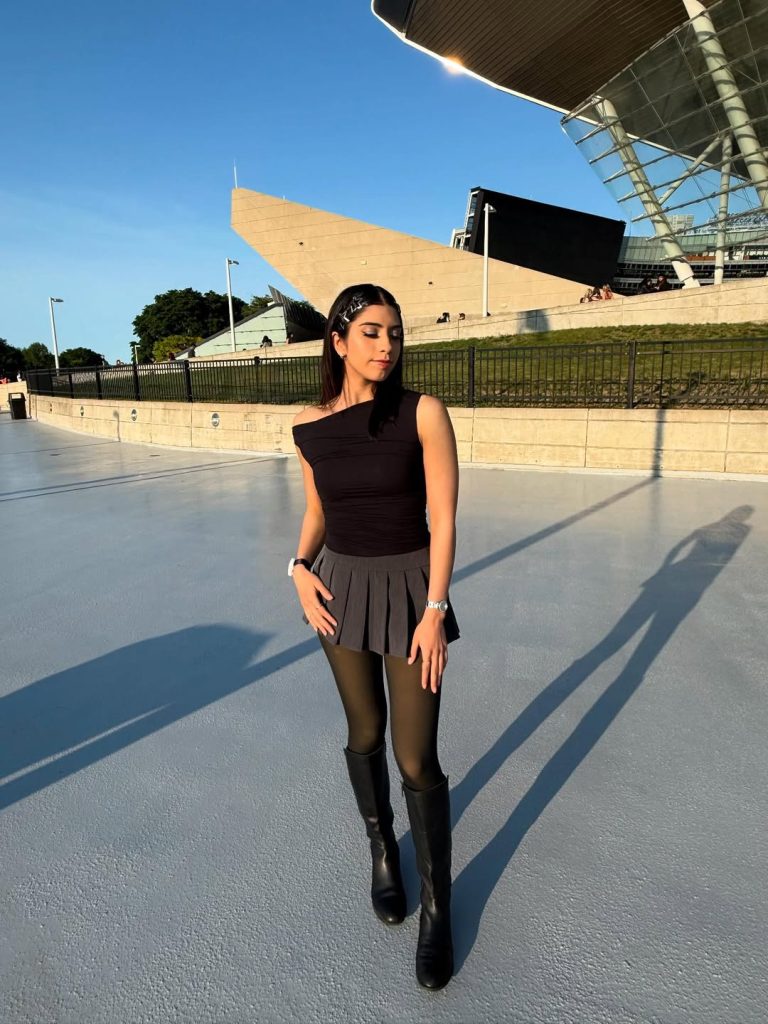 This look thrives in evening settings when concerts transition from sunset to city lights. The pleated skirt moves beautifully, while the tall boots add confidence and edge.