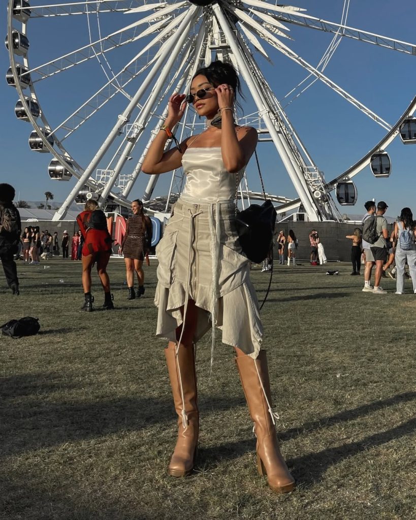This outfit blends elegance and functionality, creating a striking summer concert outfit for 2026 that feels equally stylish and comfortable. The tall boots ground the outfit, while the satin top adds a touch of glamour.