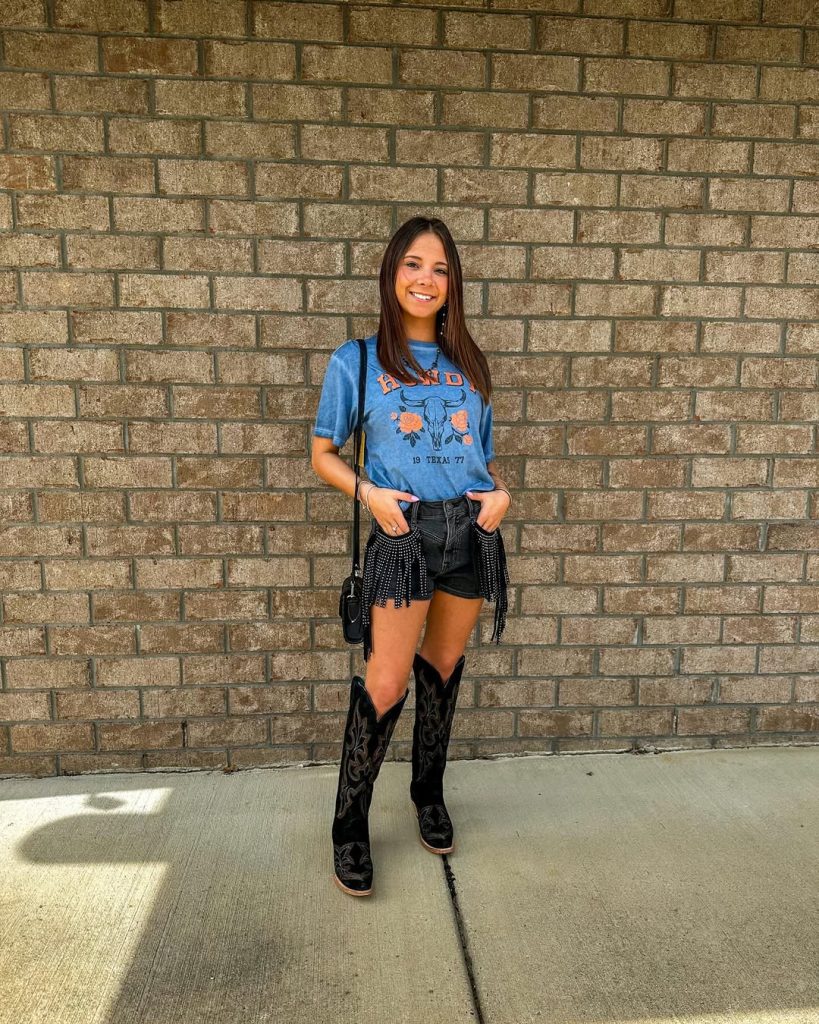 A graphic tee with western boots delivers classic country concert energy—a playful casual outfit perfect for summer festivals.