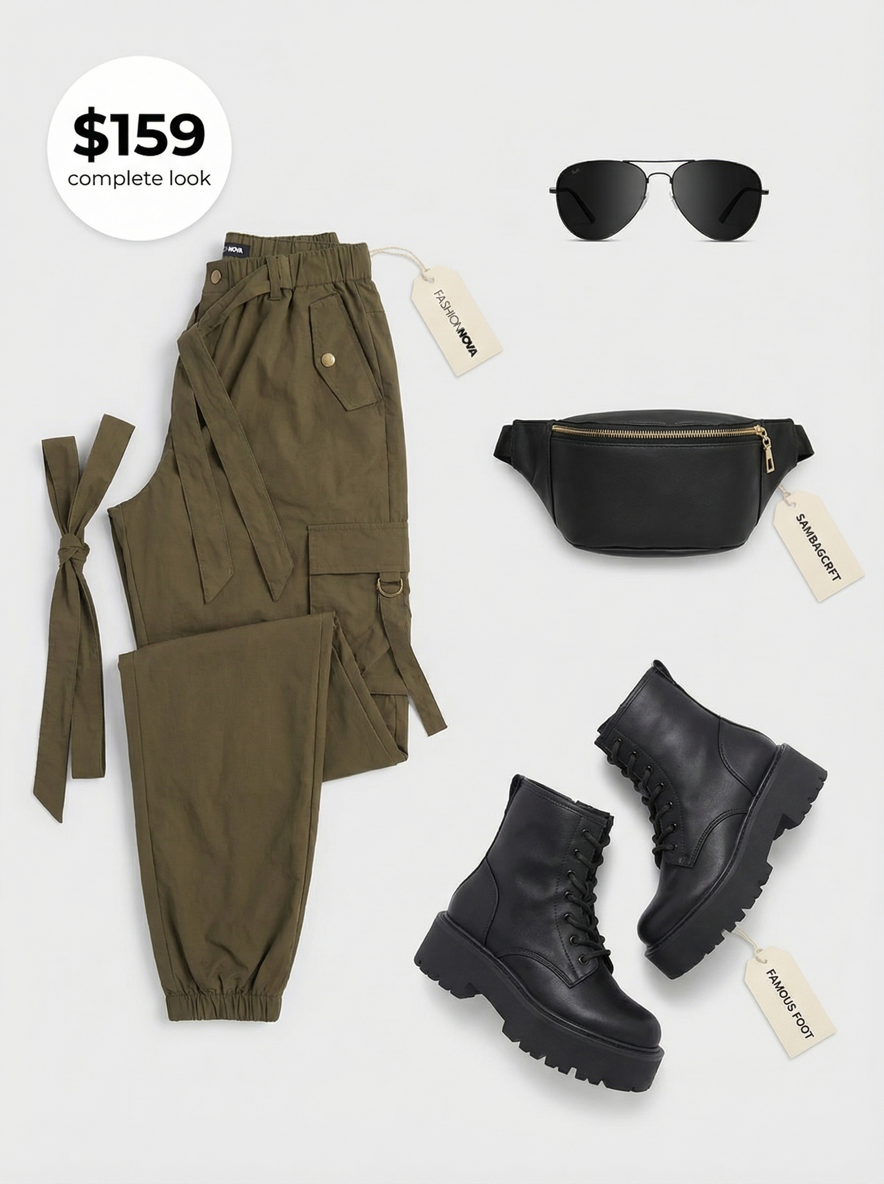 The cool-girl staple. This streetwear summer outfit for $219.99 features a pair of khaki green wide cargo pants from Garage, priced at $40, and made from durable and comfortable cotton twill material. Up top, a black square-neck ribbed top—a $12 find from Princess Polly US—contrasts the loose fit of the bottoms, defining the waist. The look is grounded by black and white platform sneakers for $29.99 from NanaMacs, giving an urban edge, making it an excellent choice for city exploration. The ribbed top stayed perfectly tucked in while exploring the city for hours.