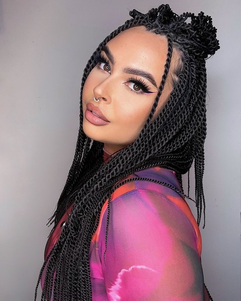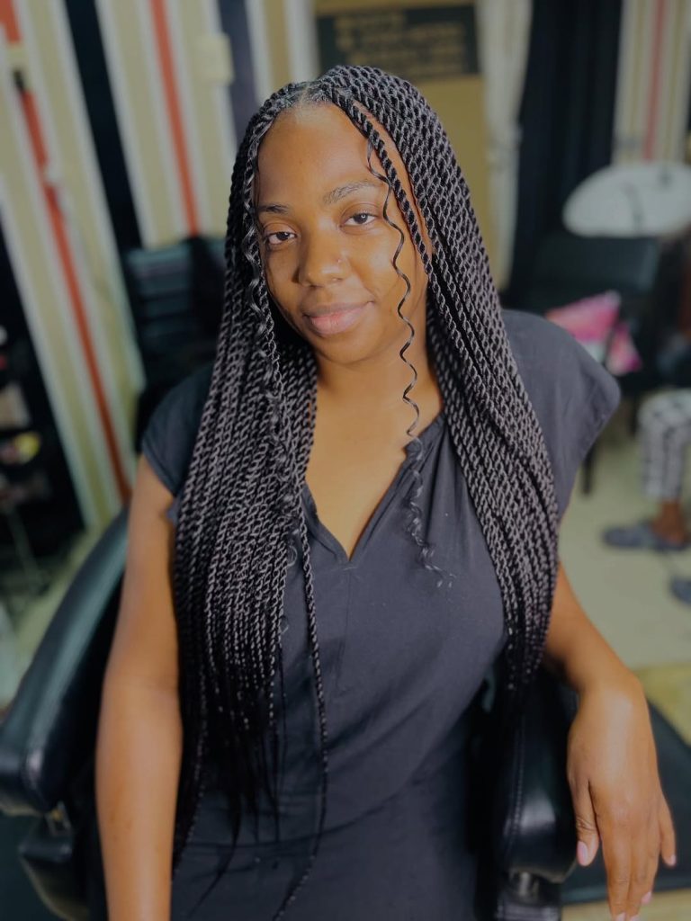 This type of Senegalese twist style is ideal for women who love protective styles that still look refined and classic. The smooth, rope-like texture works especially well for Natural hair and can last several weeks with proper care. Lightweight oils help keep the twists shiny and healthy, while wrapping the hair at night maintains neatness. Compared with looser braids, Senegalese twists give a sleeker finish that feels both professional and stylish.