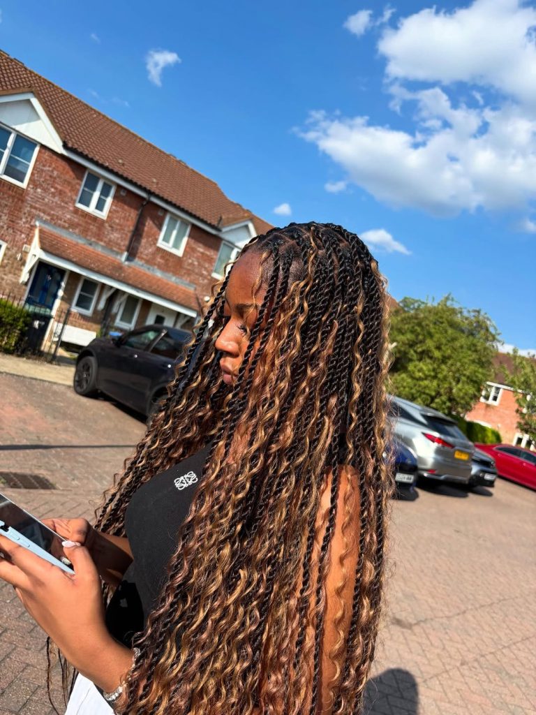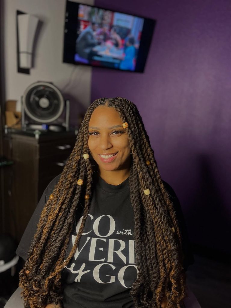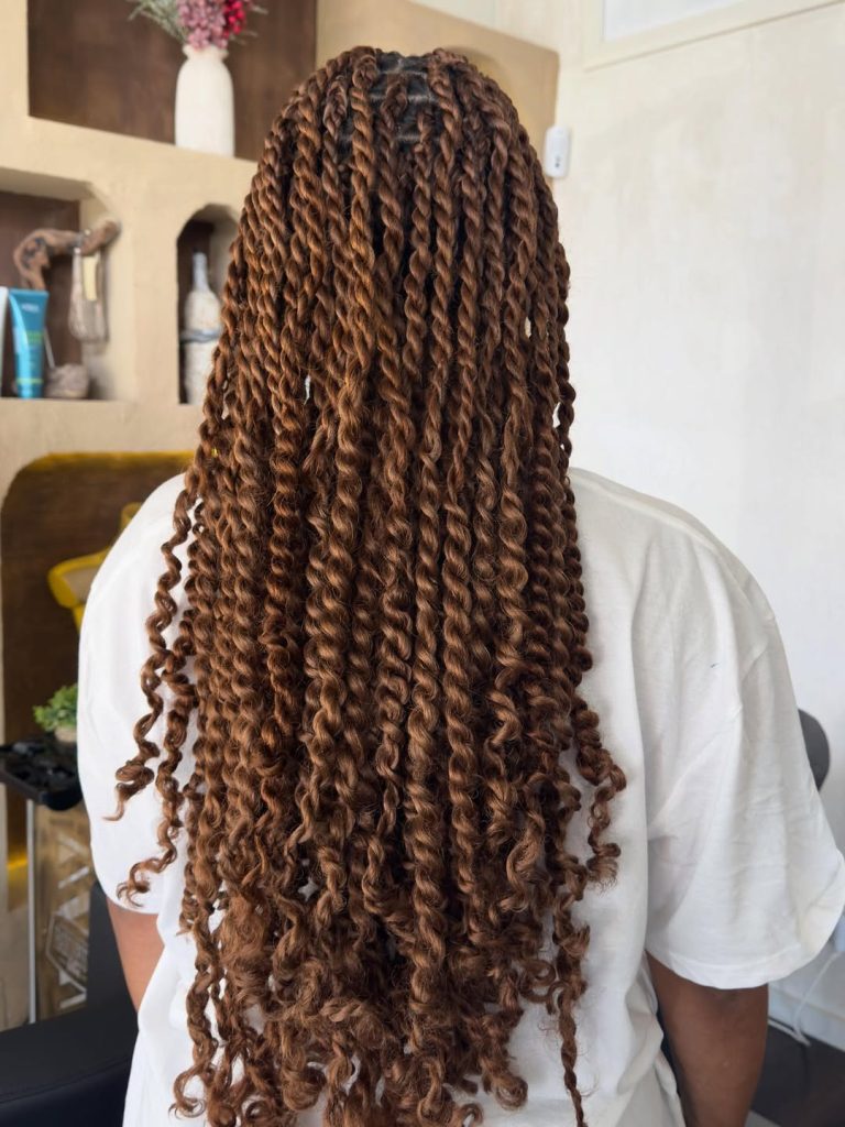 These twists are pure summer energy. The blend of deep brown twists with honey-toned highlights creates incredible dimension, while the loose curls add a soft Boho texture throughout the length. Inspired by Fulani island styles, the hair feels expressive and full of life, with every strand catching the sunlight differently. It’s bold, vibrant, and full of personality—exactly the kind of hairstyle that turns heads without trying too hard.