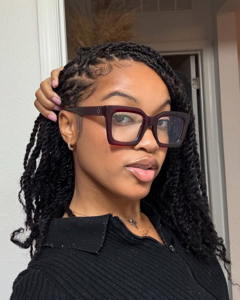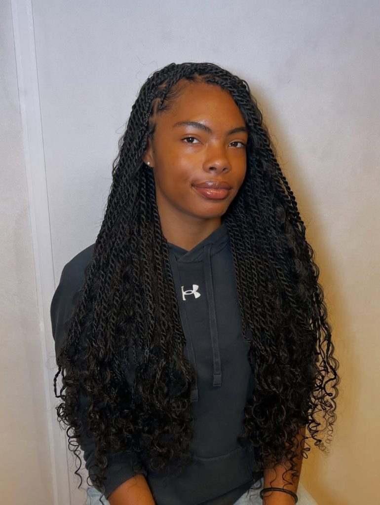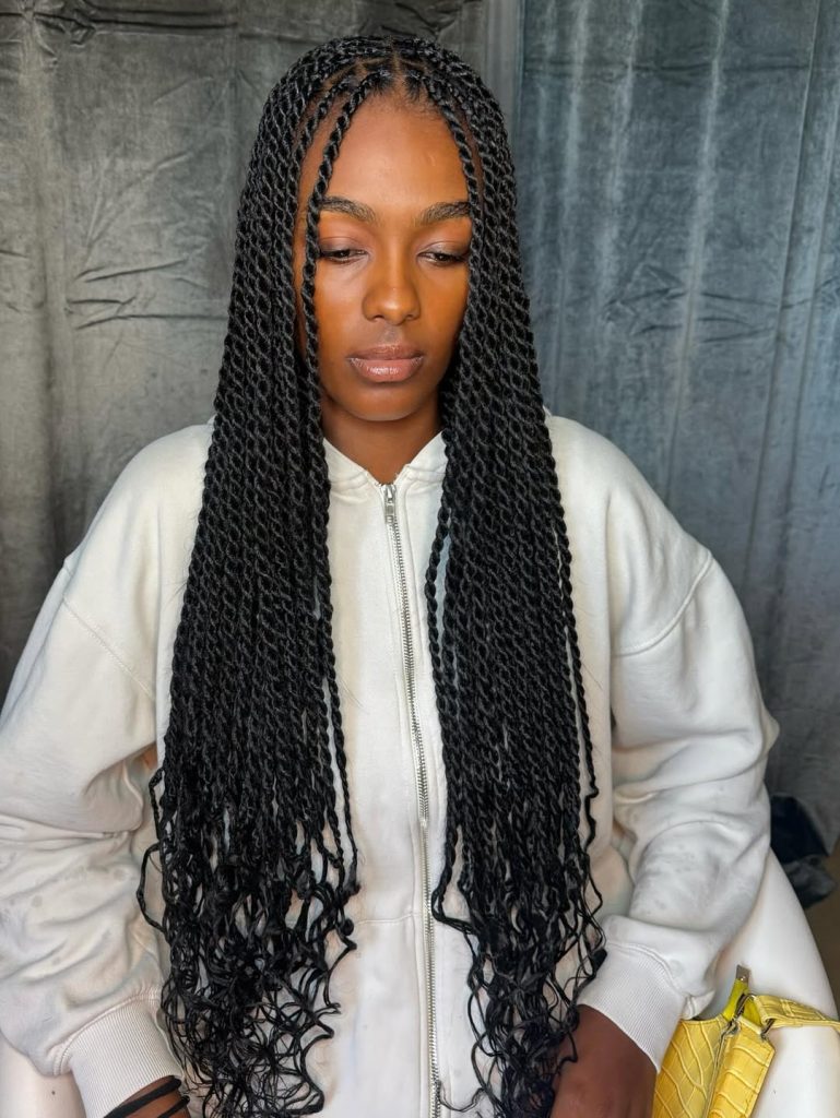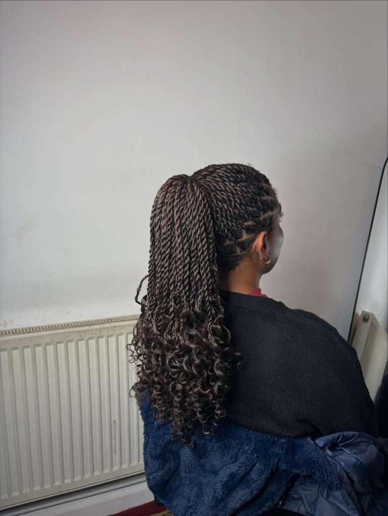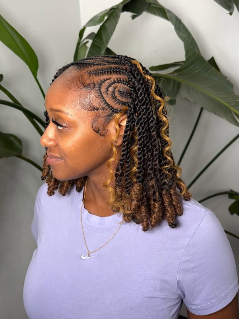 There’s something incredibly graceful about twists that end in soft curls. In this style, the twists start neat and structured at the scalp, then melt into flowing curly ends that add bounce and femininity. The overall look carries subtle Fulani island inspiration, blending traditional braiding influence with a modern twist technique. The contrast between the defined twists and lively curls creates a style that feels rich, dimensional, and full of personality.