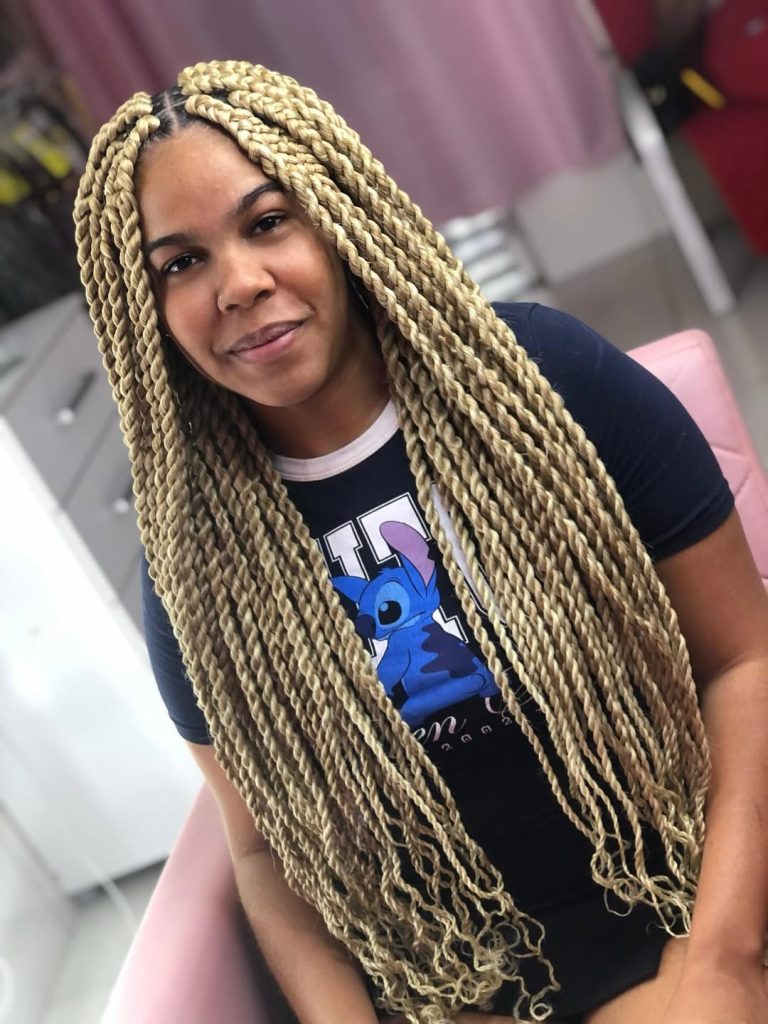 Bold color and strong texture instantly make these twists unforgettable. The thick Jumbo Marley twists fall in long, dramatic sections that create an eye-catching silhouette. The Afro kinky texture gives the twists depth and fullness, while the light blonde tone adds brightness and personality. This look feels confident, playful, and full of character—exactly the kind of hairstyle that stands out in the best possible way.