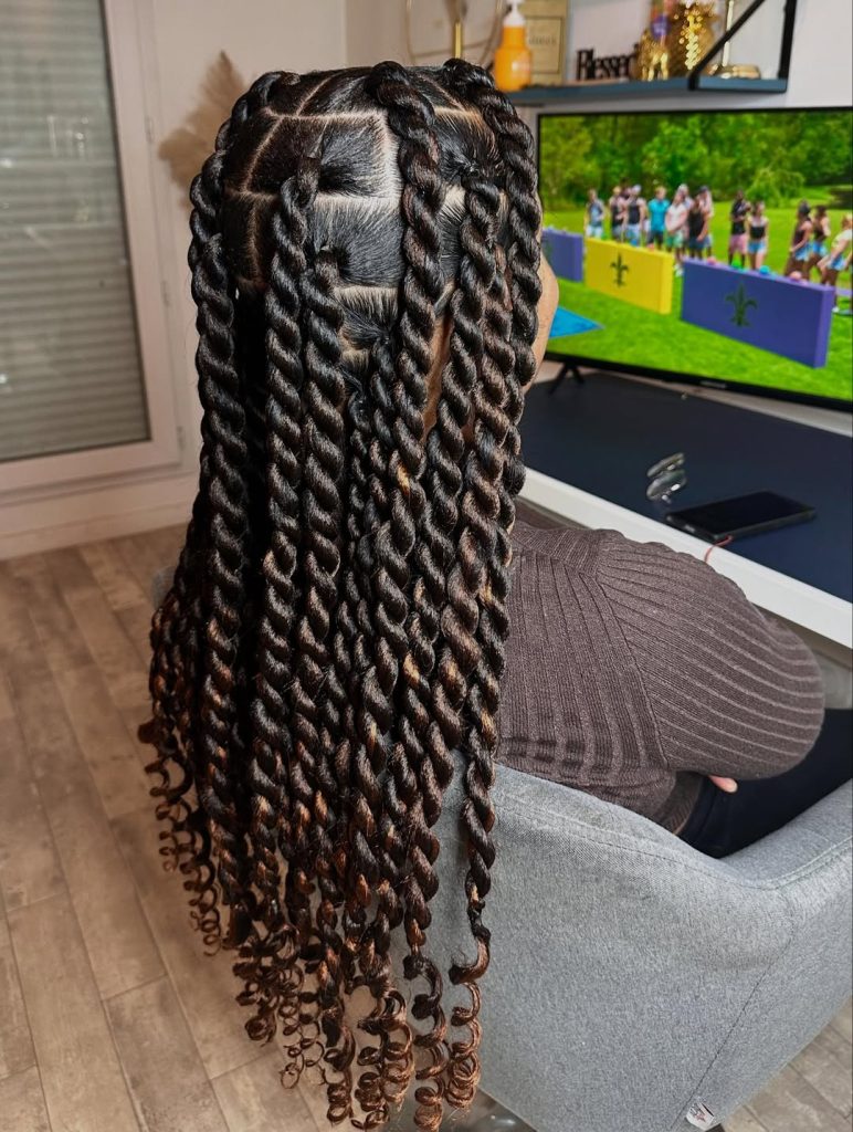 This style works beautifully with Natural hair and is perfect for women who love protective styles that still feel playful and have a lot of texture. The curly ends keep the twists from feeling heavy and give the hair a lighter silhouette compared with traditional braids. A little curl mousse or lightweight leave-in conditioner will help maintain those defined spirals. It’s a lovely option for anyone wanting a Cute style that balances structure with soft movement.