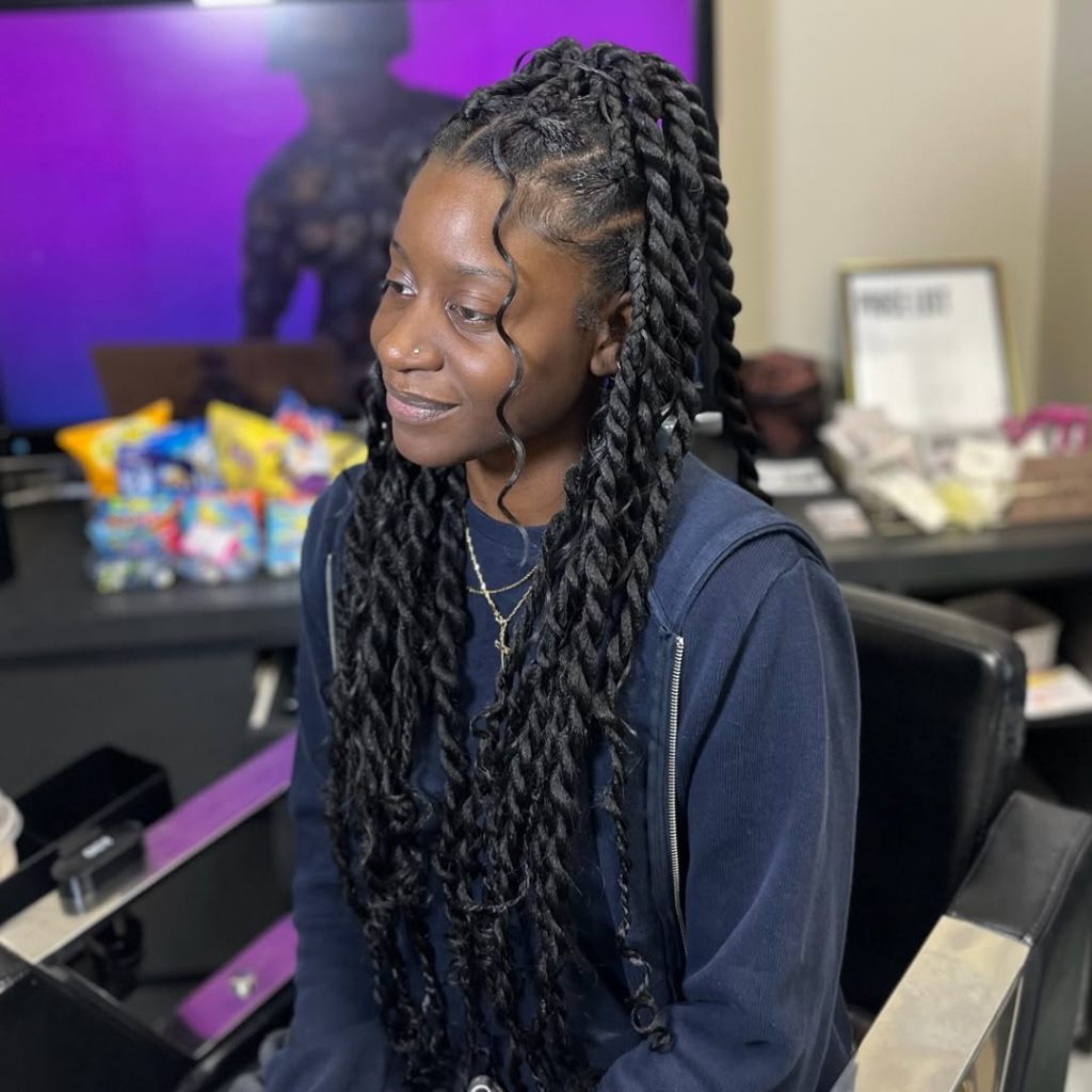 Jumbo twist styles like this are perfect for women who want protective styling with personality. The thicker sections reduce installation time and create a fuller look that stands out without feeling heavy. This style works especially well for Natural hair and can easily shift between casual and dressed-up moments. Whether paired with bold earrings or simple makeup, the overall vibe is confident, stylish, and effortlessly cool.