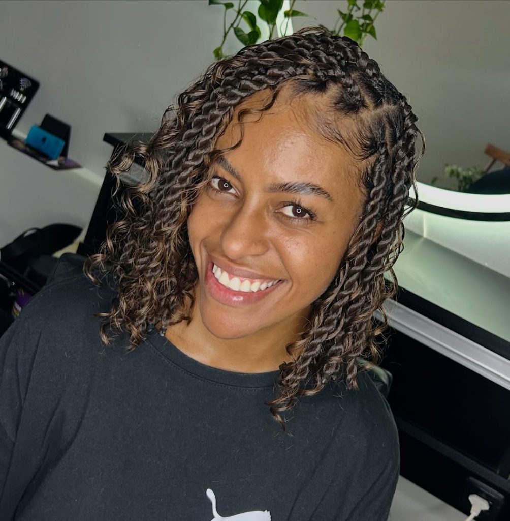 Some hairstyles instantly brighten the whole face, and these Short Boho twists do exactly that. The twists are neatly parted along the scalp and then soften into lively curls that bounce around the shoulders. The texture feels relaxed and playful, almost like the hair has its rhythm. With the gentle waves framing the face and the subtle shine throughout the strands, the overall effect feels youthful, natural, and effortlessly Cute.