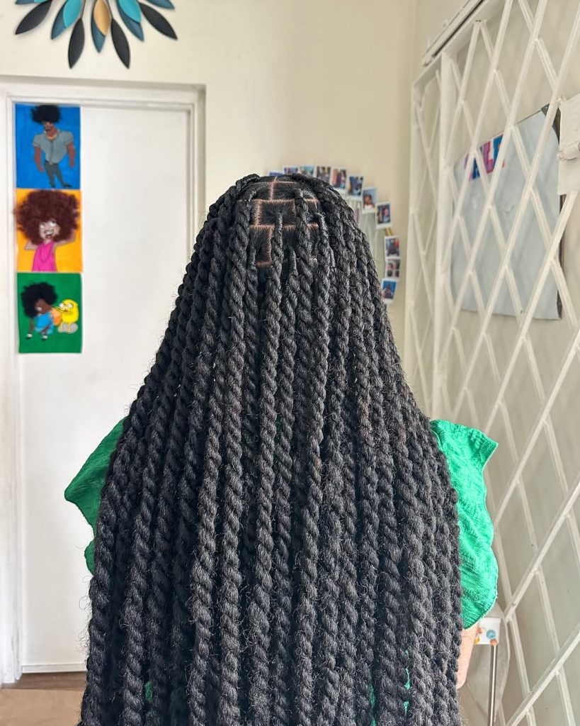 This style works beautifully for women with natural hair who want a protective look but still feel stylish and dynamic. Marley twists are especially flattering for thick or textured hair because they create volume without feeling heavy. The half-up structure keeps hair off the face, which is ideal for busy days, while still letting the length shine. With a little mousse and light oil to maintain shine and definition, these Jumbo twists stay fresh for weeks and easily transition from casual days to evening plans.