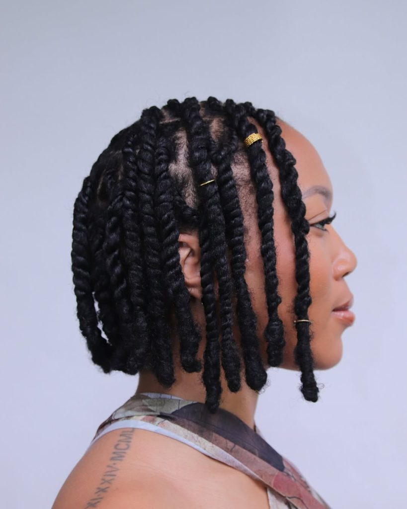 There’s something beautifully polished about a short twist bob like this. The thick, sculpted twists fall just around the jawline, creating a clean shape that instantly frames the face. With a few delicate gold cuffs placed throughout the twists, the style feels refined but still playful. It has that effortless charm where every detail looks intentional, yet the overall vibe remains relaxed and modern. The compact length gives the hairstyle a fresh, contemporary feel that’s both stylish and easy to wear.
