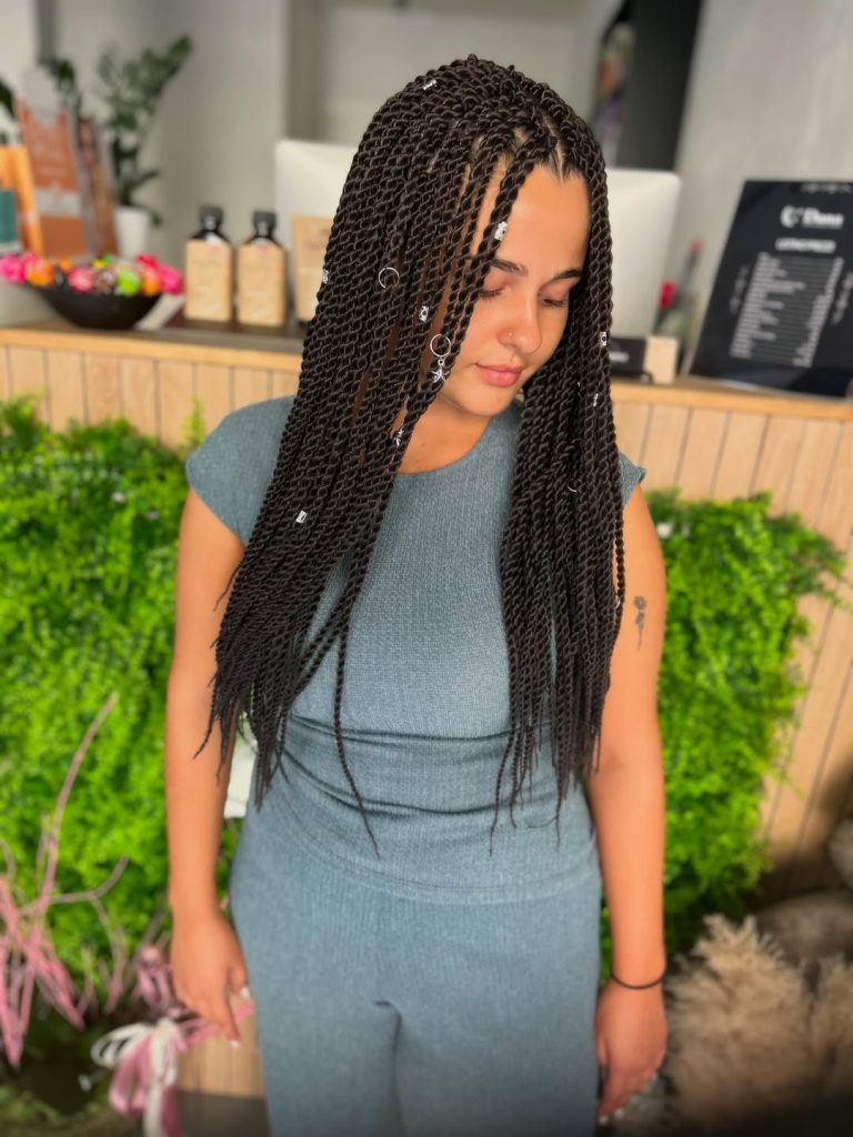 There’s something mesmerizing about rows of perfectly installed twists. These Senegalese Strand twists fall smoothly past the shoulders, creating a sleek curtain of hair that moves with every step. The addition of small rings and beads gives the style a subtle sparkle, making it feel both playful and polished. Each twist feels like a delicate thread woven into a larger story of texture and movement.