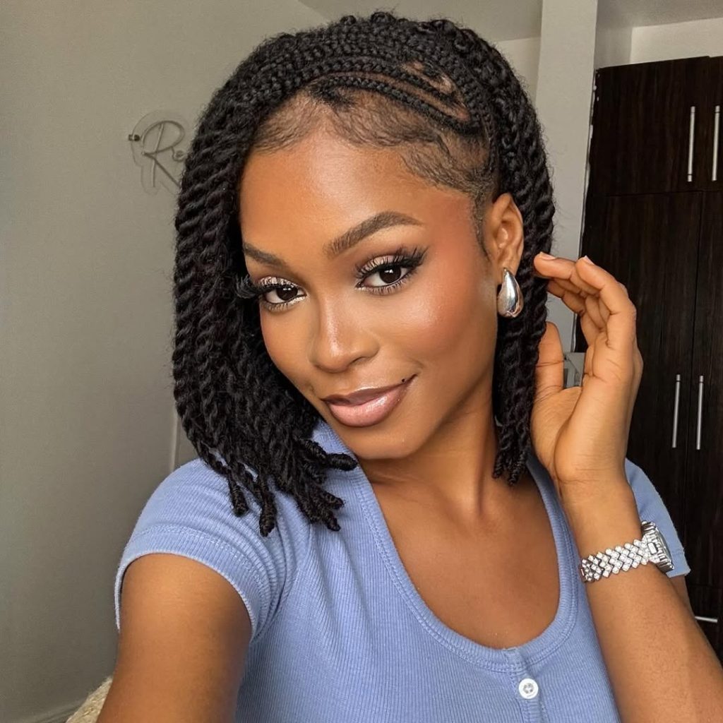 This hairstyle demonstrates that you don’t need long twists to create a striking statement. The Cute bob length gives the look a soft, youthful energy, while the Flat front braiding detail adds structure and elegance. The twists frame the face in a flattering way, creating a style that feels both casual and sophisticated at the same time. It’s one of those looks that instantly brightens your overall appearance.