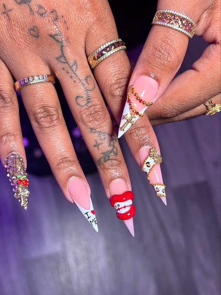 These long acrylic nails capture the fearless spirit of baddie style—sharp stiletto tips, a glossy pink base, and rich gold chain accents that instantly command attention. The mix of edgy lip art and playful “I love me” lettering gives off pure confidence and self-adoration energy, like an Instagram moment frozen in time. Every detail feels intentional yet effortlessly extra, making them perfect for someone who wants all eyes on her hands.