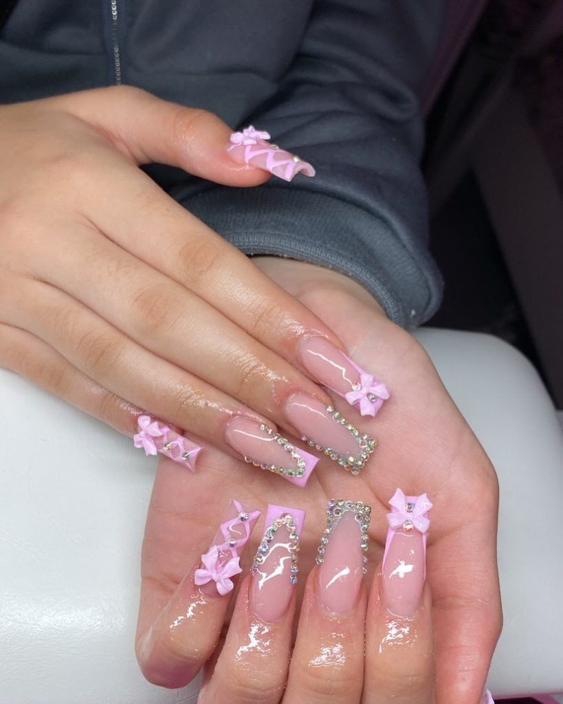 These adorable pink nails bring a soft, feminine take to baddie inspo. Glossy nude bases are framed by baby pink edges, topped with 3D bows and sparkling crystals. They feel sweet yet bold—like a Barbie dream with attitude. The way the gems catch the light gives them that picture-perfect Instagram finish.