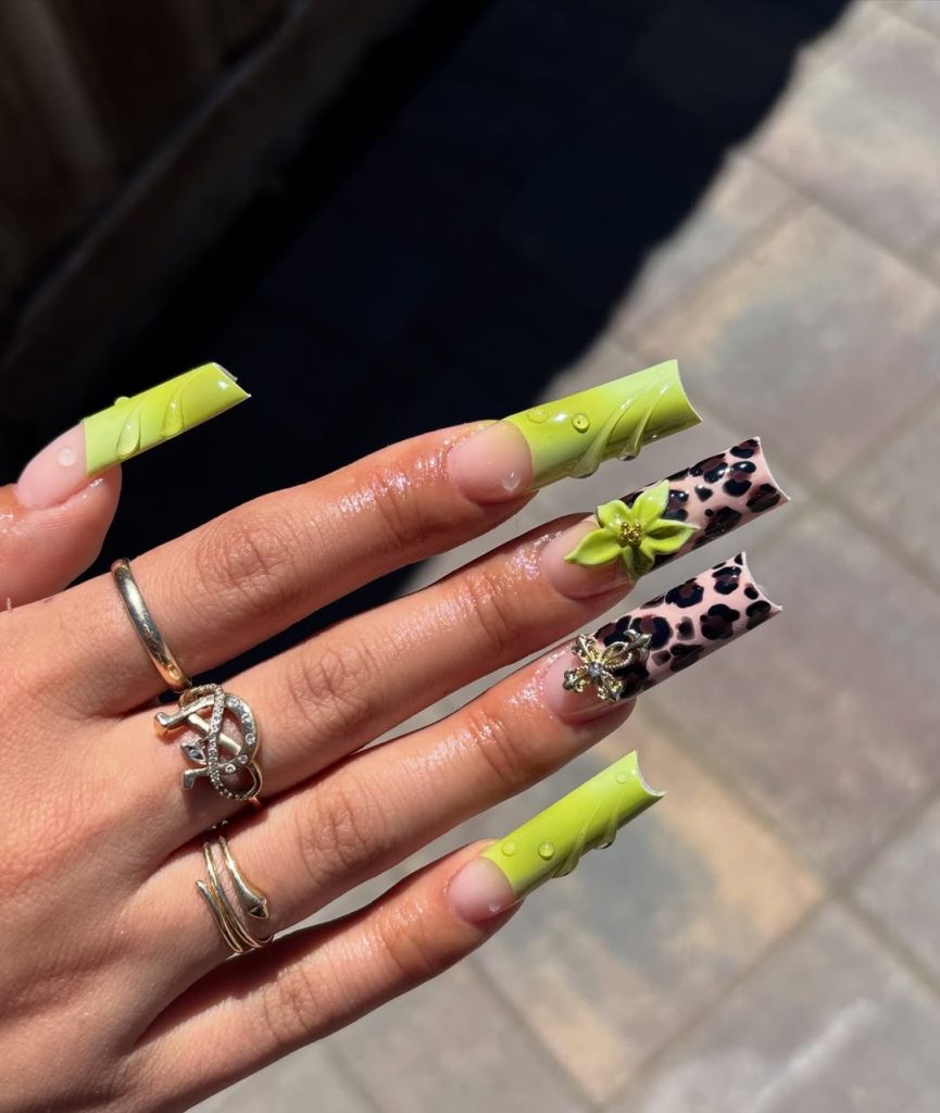 These lime green acrylic nails bring a burst of confidence and playful sass. The glossy neon hue pairs with chic leopard print and a single 3D flower accent, creating that perfect mix of wild and flirty. It’s fresh, fearless, and made for anyone who loves to stand out under the sun.