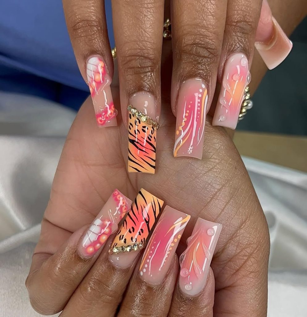 These nails are a tropical dream—swirls of orange, pink, and yellow flow together like a fiery sunset. With tiger stripes, abstract dots, and hints of sparkle, they radiate pure summer energy. Each nail feels like a small piece of art, blending bold design with effortless elegance.