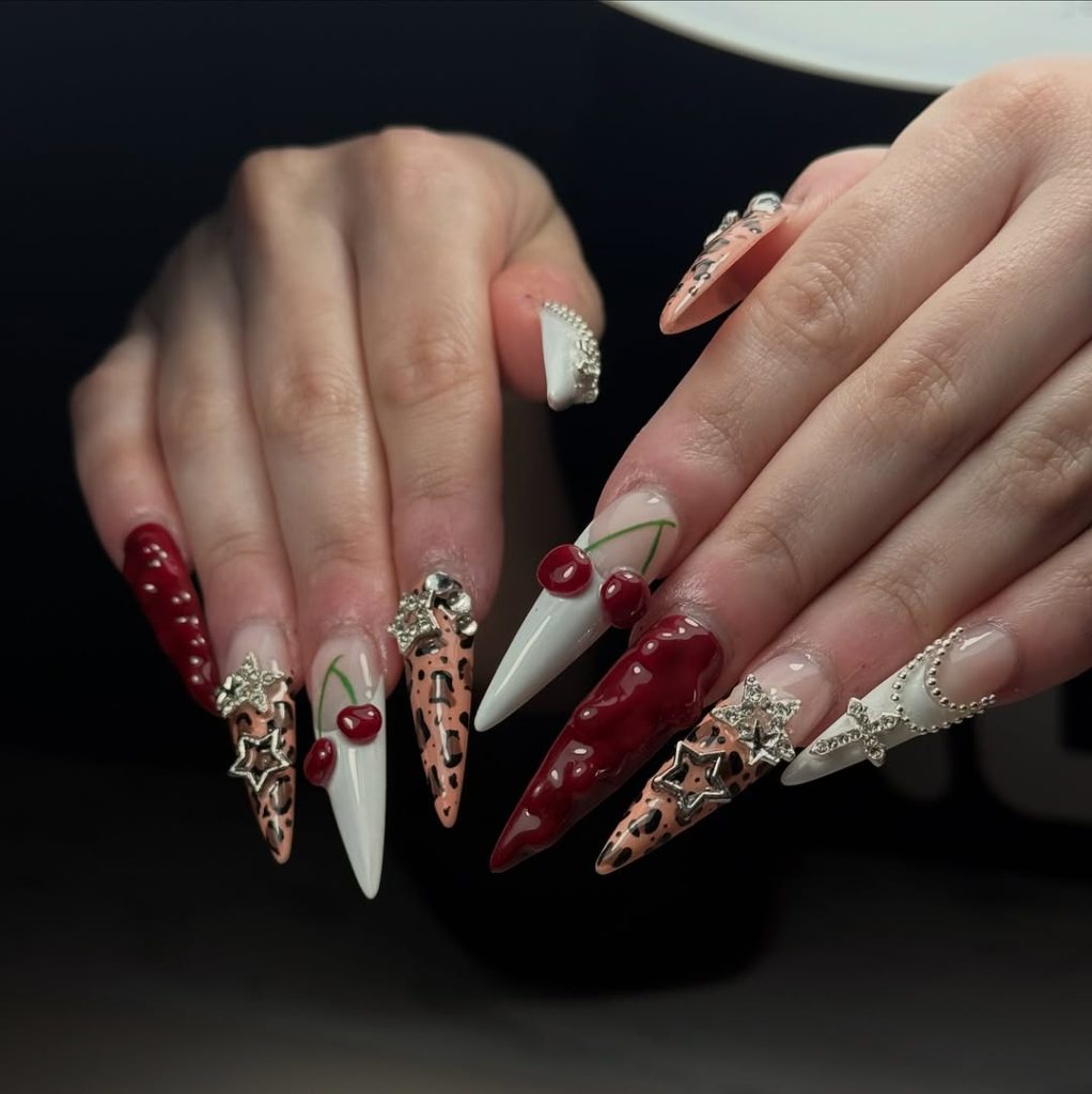 Playful yet dangerously chic, these stiletto nails fuse deep red cherries, nude tones, and leopard print for a glam look that’s equal parts sweet and fierce. Silver charms and 3D stars add the perfect amount of edge. It’s a design that channels Y2K attitude with a luxurious twist.