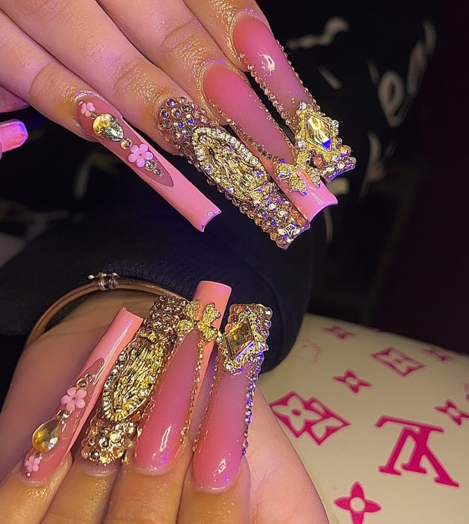 These long pink acrylic nails take luxury to the next level. Gold chains, gemstones, and 3D floral accents make them feel like wearable jewelry. Every finger glows with a touch of opulence—perfect for anyone who believes more is more when it comes to glam.