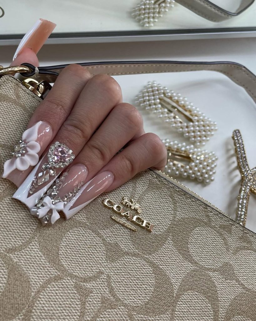 These nails are pure elegance with a girly twist—white French tips lined with gems, heart-shaped crystals, and delicate 3D bows. The glossy pink base adds softness, while the sparkle brings instant glamour. It’s a manicure that feels straight out of a luxury beauty editorial.