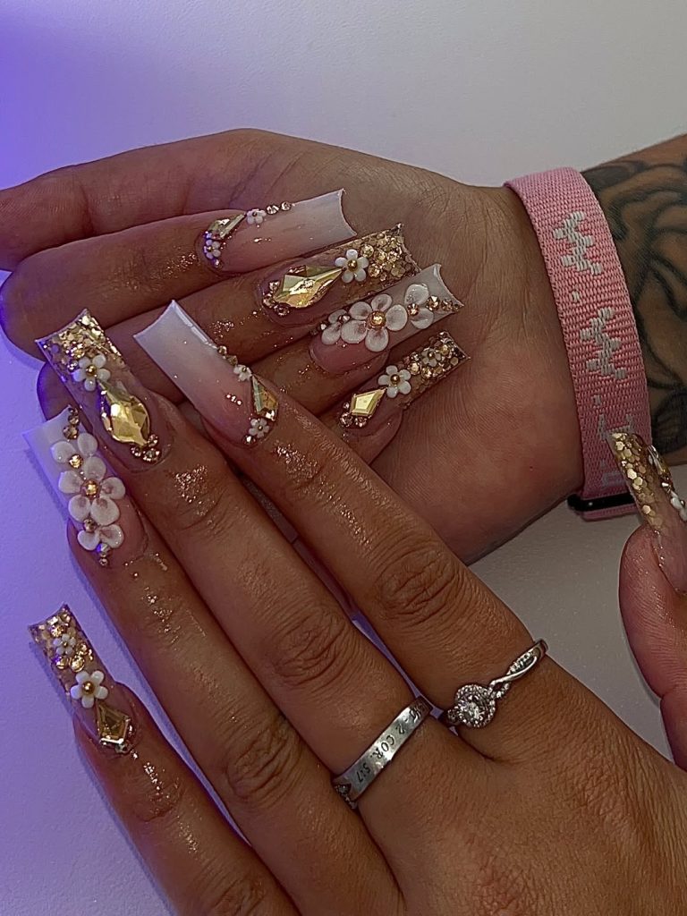 With gold gems, 3D white daisies, and soft pink undertones, these acrylic nails epitomize luxe. The sparkles embellishing each finger for varying lights and angles add to the rich and romantic effect. Each nail feels like a piece of intricate jewelry—glamorous, classy, and rich in character, distinct to each nail.