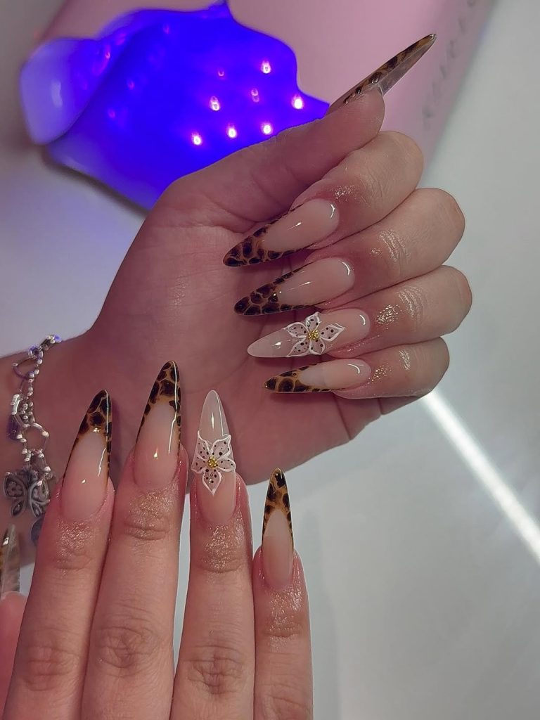 These long almond acrylic nails bring out your wild side with chic leopard tips and a single white flower accent. The soft nude base keeps them elegant, while the animal print adds the perfect amount of attitude. It’s a simple yet sophisticated design that screams confidence.