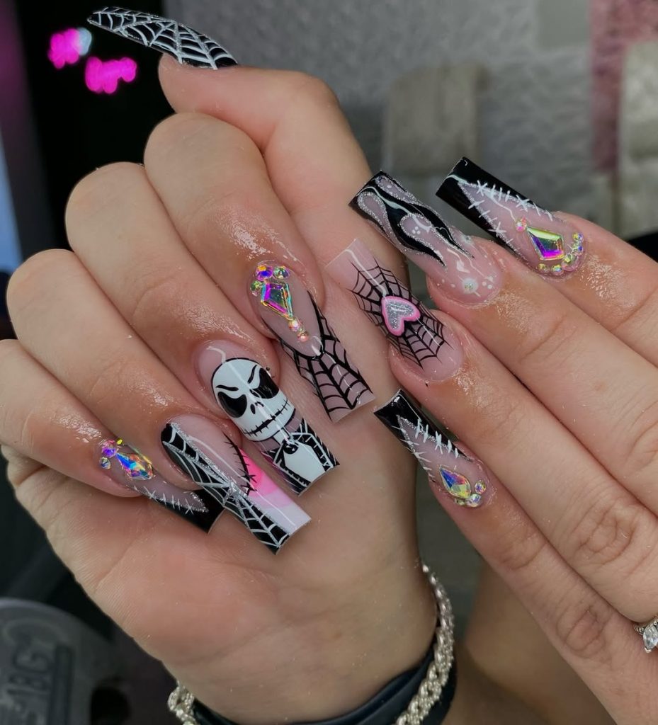 This black and pink design fuses dark glamour with playful Halloween inspo. Featuring web details, skeleton art, and holographic gems, it’s bold and unapologetically dramatic. Every detail gives off that edgy Y2K-meets-goth aesthetic that’s trending hard for 2026.