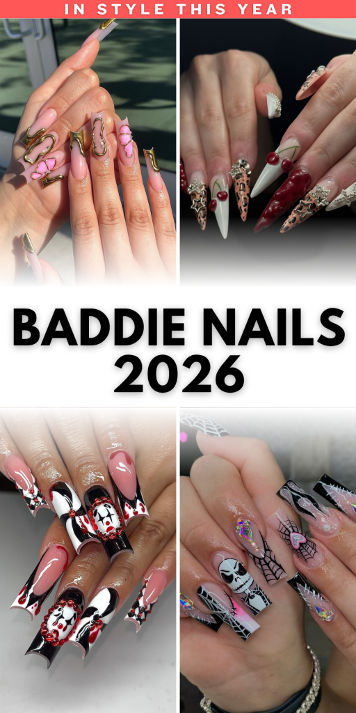 Baddie nails in 2026 are all about confidence, luxury, and creativity. This year’s looks blend high-glam details like gold charms, rhinestones, and 3D flowers with edgy patterns and modern color palettes. From bold black acrylics to feminine pink designs, every style celebrates the unapologetic, fashion-forward energy that defines the modern baddie. Whether you prefer soft glam or full drama, these nail ideas are your new obsession.