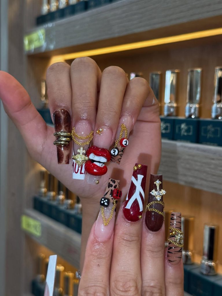 These long coffin acrylic nails are a true beauty with the warm, deep red shades, the metallic gold, and the 3D gold lips along with the retro Y2K gold lips and stacked dice charms. Each nail conveys a unique, bold charm and attitude, beaming confidence and style. The whole design layout is creative, and it feels as if you are wearing a music video with luxurious, stylish nails, glammed and spoiled for a night out with the girls. It’s a wonderful nail design.