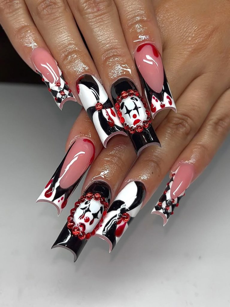 These red and black acrylic nails showcase the epitome of contrast. They are dramatic and artsy and fearlessly embrace the gothic style. The diamond shapes, clown-face embellishments, and striking red rhinestones create a cohesive and confident gothic glam look.