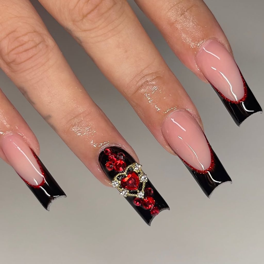 These nails are a love letter to dark romance. The glossy black base with subtle red French tips feels elegant yet powerful, while the heart-shaped gem centerpiece adds a seductive spark. It’s a perfect mix of classy and daring, ideal for anyone who loves statement-making designs with a touch of gothic allure.