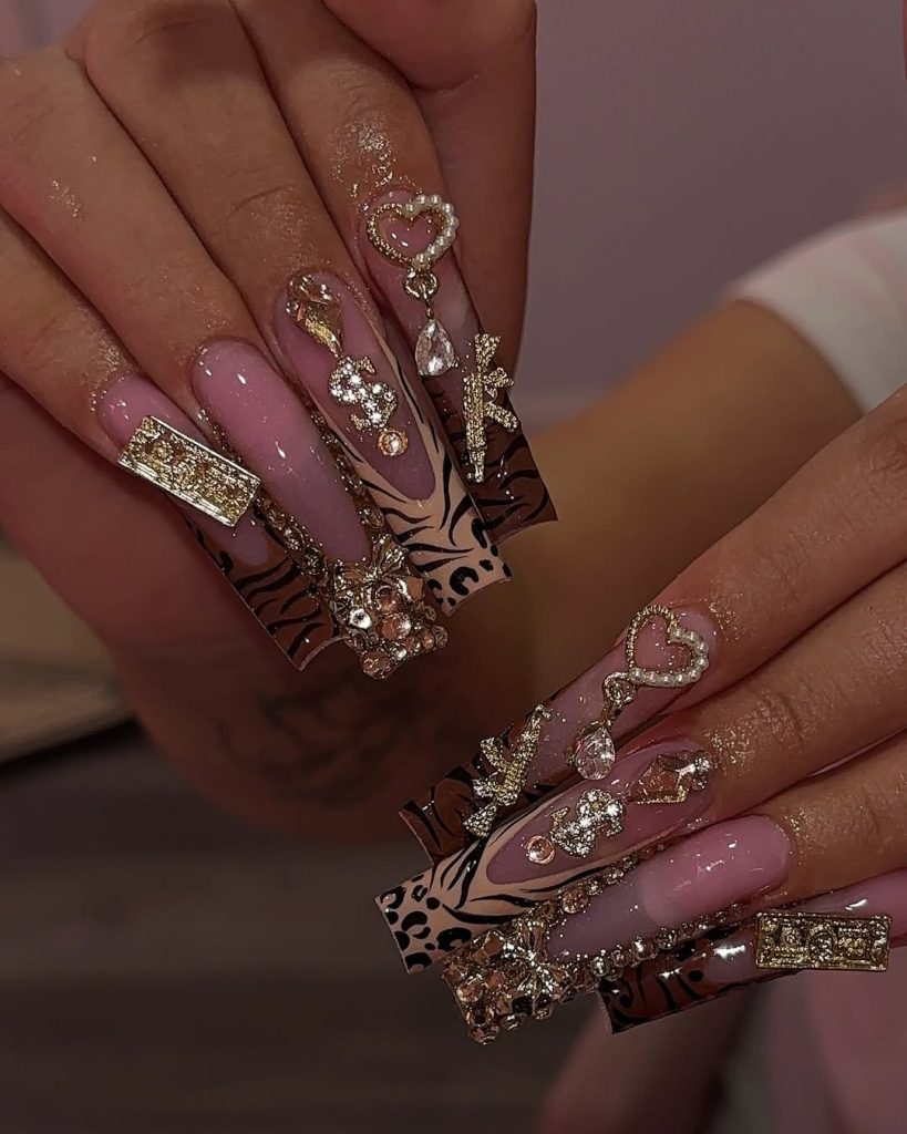 These long acrylic nails channel pure luxury with bold zebra and leopard patterns, pink tones, and extravagant gold charms. Each nail is covered in jewelry-like embellishments—hearts, crosses, and dollar signs—that bring that high-fashion baddie energy straight from the runway to your hands.