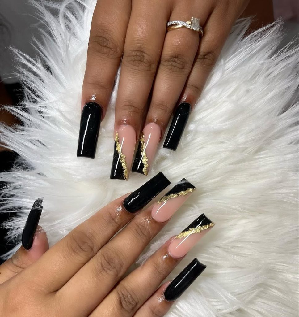 Sleek and timeless, these glossy black acrylic nails get an instant upgrade with gold foil diagonals. The simple yet striking contrast of nude and black adds drama without overcomplicating things—a perfect choice for minimalists who still love luxury.