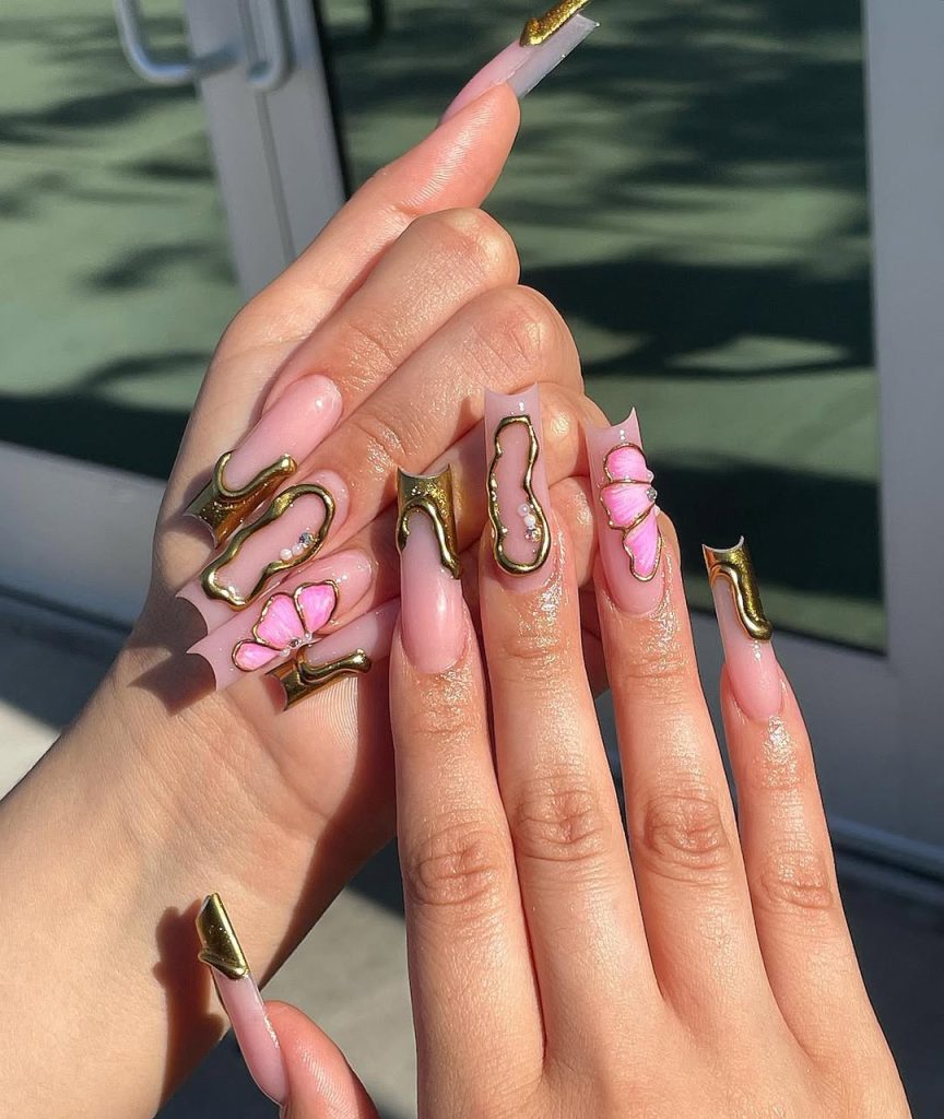 Perfect for nights out or photoshoots, this inspo works best on long coffin or square shapes. It complements warm undertones and looks stunning under evening lights. For a long-lasting effect, use cuticle oil daily and avoid harsh chemicals to keep those gold details pristine.