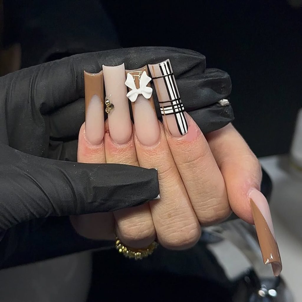 Perfect for colder months, this look works beautifully on medium to long nails. It complements warm sweaters and gold jewelry for a complete seasonal look. The plaid detail adds character, while the bow softens the vibe—classic baddie inspo done right.