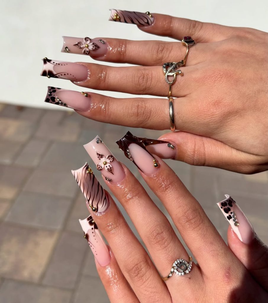 These brown animal print nails blend fierce and feminine with zebra and leopard details across a soft nude base. Gold studs and 3D floral accents add a hint of luxury, while the glossy finish keeps everything looking sleek. It’s an effortlessly chic design that transitions from day to night with ease.