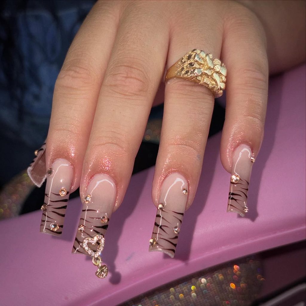 This glamorous set features zebra stripes in soft brown tones accented with gold charms and delicate crystals. The combination feels elegant yet daring, ideal for those who love neutral tones but still want their nails to make a statement. The dangling heart charm adds the perfect playful touch.