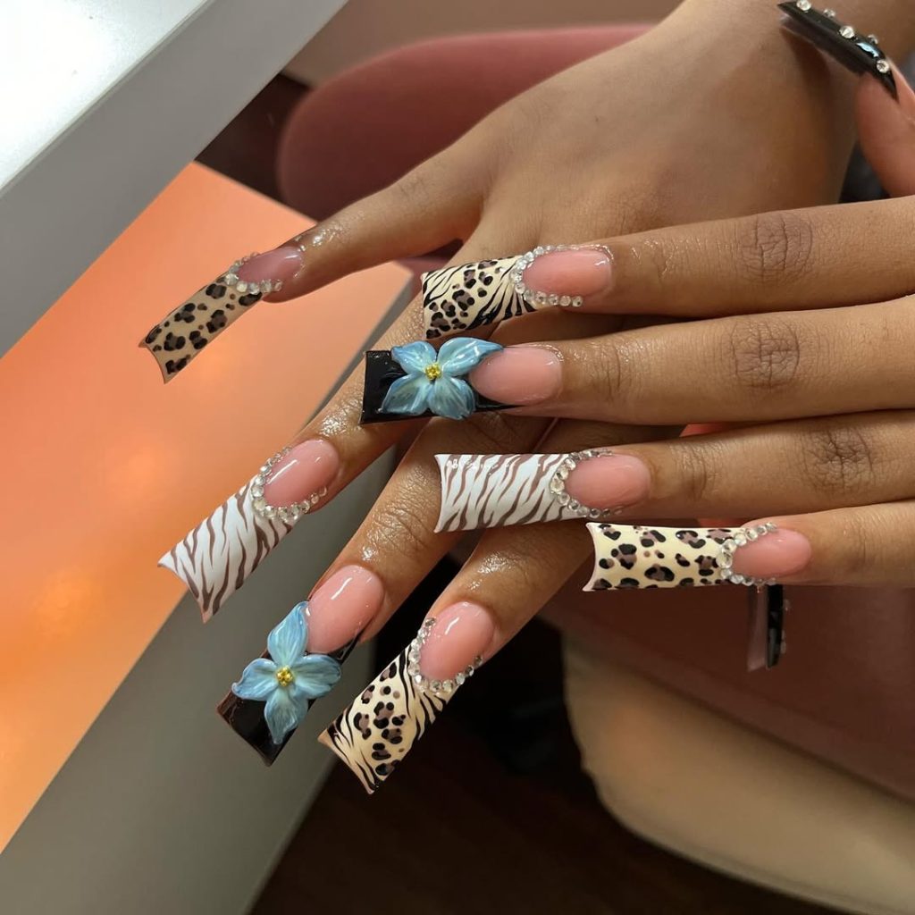 This design brings together classic animal print and cute feminine flair. The mix of zebra and cheetah patterns with 3D blue flowers adds a playful, unexpected twist to baddie style. It’s equal parts wild and classy, perfect for those who love standing out without losing that polished edge.