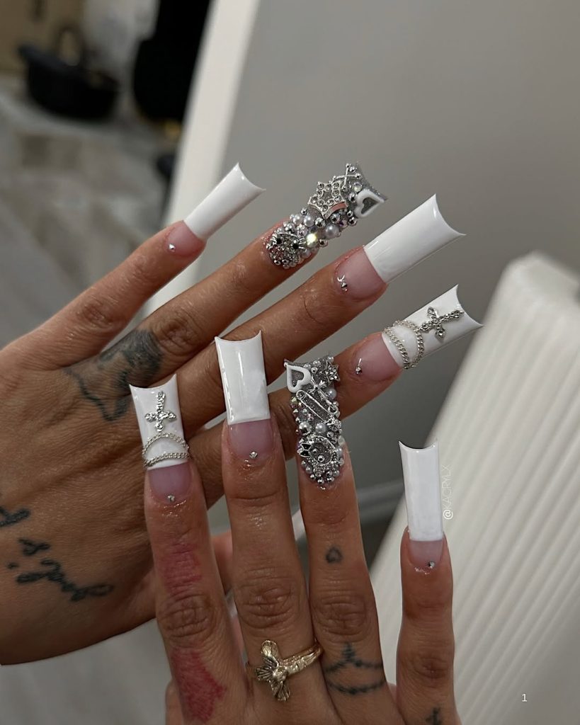 These stunning white acrylic nails redefine classy baddie energy with icy precision. The clean white base is paired with 3D silver gems, tiny chains, and bold cross charms that add instant drama. They have that “rich girl minimalism” vibe—simple in color but intricate in texture and design.