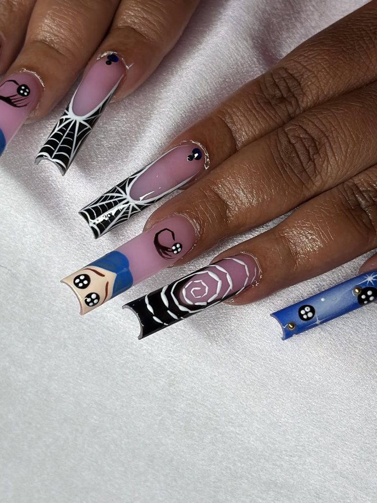 This spooky-chic design brings a playful twist to baddie nails with its mix of spiderwebs, swirling patterns, and cartoon-inspired faces. The purple and black combo adds a moody yet artsy vibe that feels straight out of a Tim Burton dream world. It’s perfect for anyone who loves mixing cute with creepy—stylish rebellion wrapped in intricate nail art.