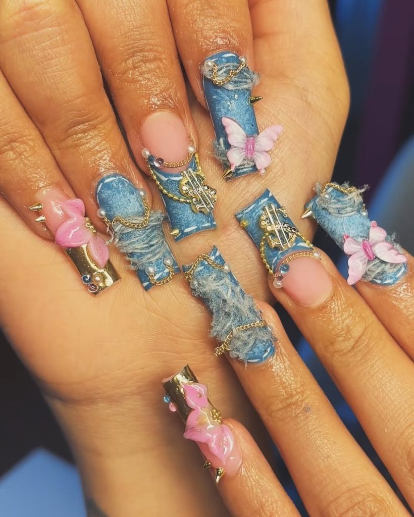 Blue denim-textured nails shift the aesthetic of a modern baddie. Chains, pearls, and pink 3D butterflies soften the look, which strikes a nice balance with the rugged denim. The interplay of textures is striking, ensuring every gesture you make is a fashion statement.