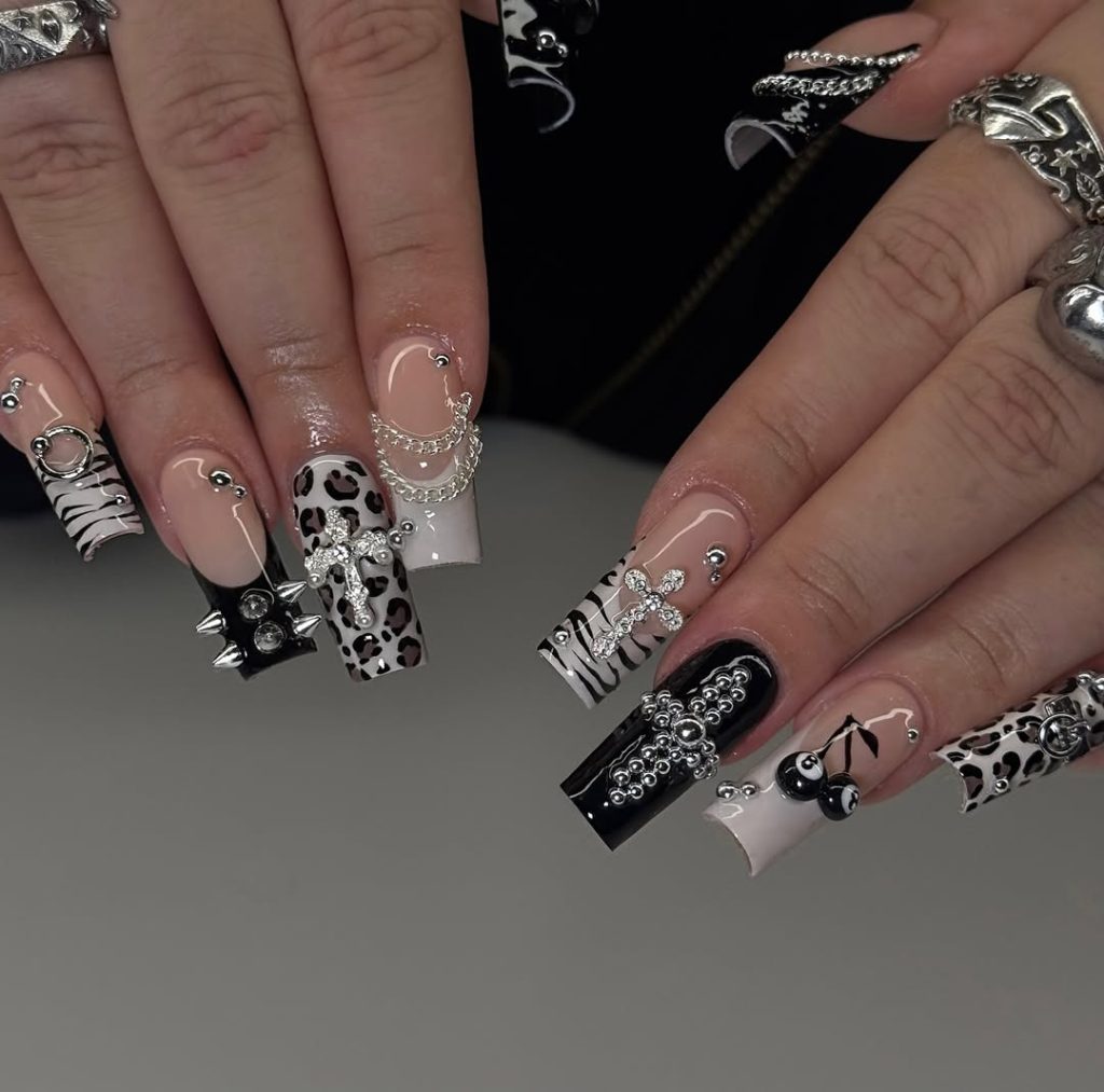 Bold yet balanced, these acrylic nails mix leopard print, zebra stripes, silver crosses, and metallic accents in a stunning monochrome palette. It’s pure Instagram glam—fierce, confident, and polished. The 3D studs and chains add a rebellious edge, making this set a statement piece for anyone who loves fashion-forward nail art.