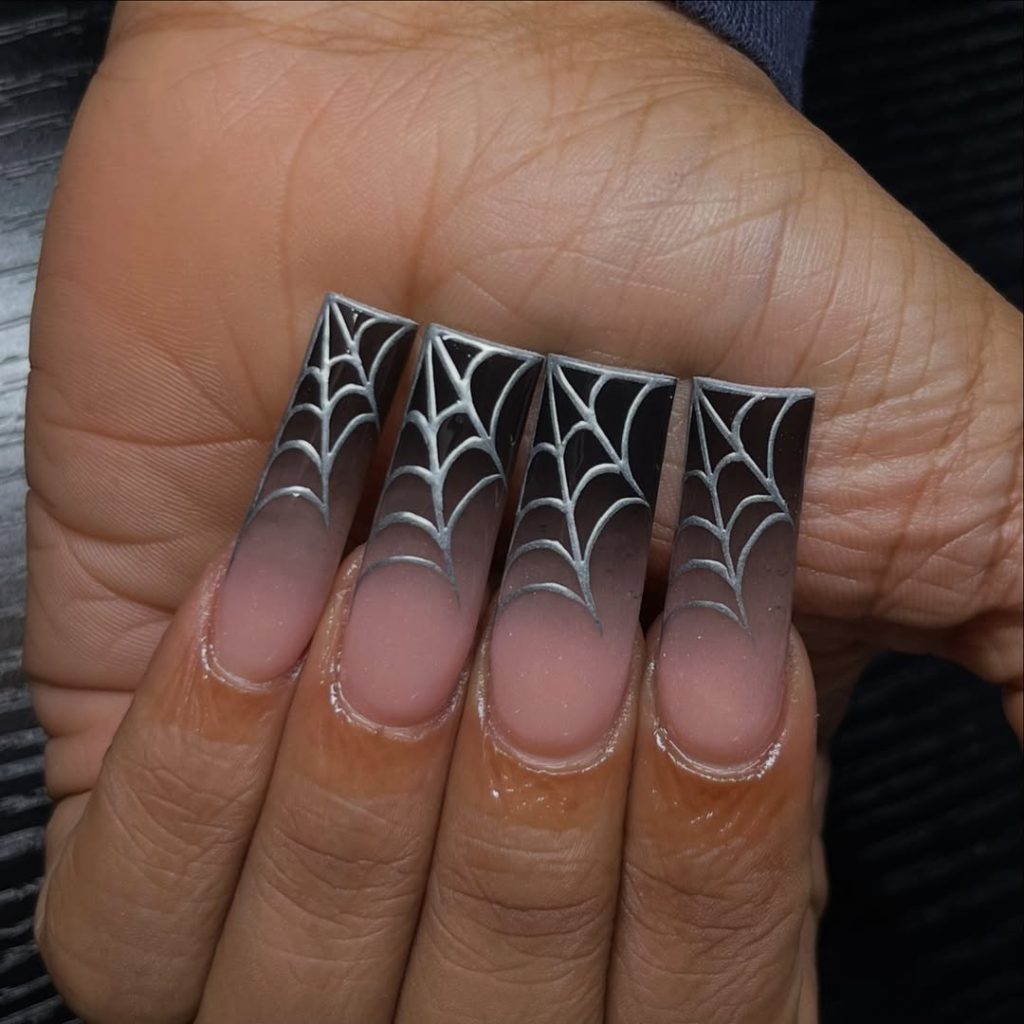 Dark, mysterious, and effortlessly cool—these nails take the spiderweb trend to a minimalistic new level. The smooth nude-to-black gradient is topped with fine silver web details, giving off a futuristic, moody effect that’s both understated and bold. It’s gothic glamour done in the most sophisticated way.