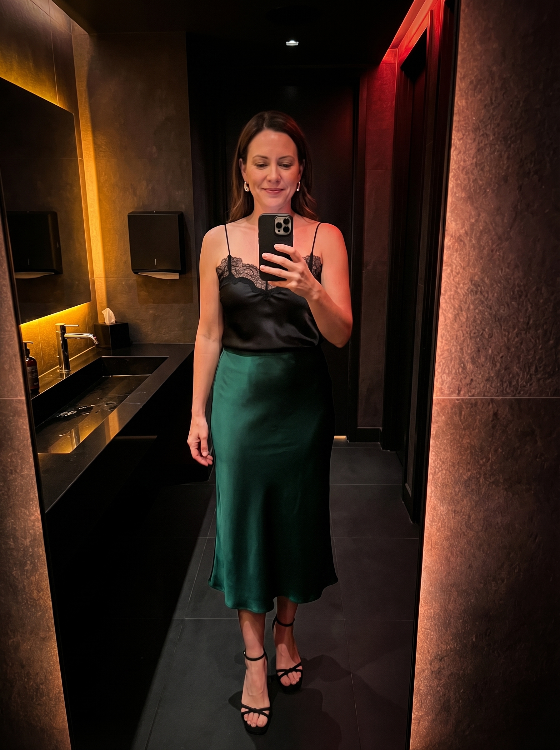 So chic. This elegant summer evening look, totaling $427.80, features a vibrant emerald green Quince satin midi skirt, priced at $69.90, that draped beautifully and mercifully didn’t cling during a humid date night. I paired it with a black lace-trim cami—for $59.90, it adds just the right delicate texture. The black suede sandals from Tony Bianco US, at $150, complete the ensemble with classic glamour, elongating the leg without looking fussy. This is an aspirational yet effortlessly chic option, especially for a Pinterest audience.