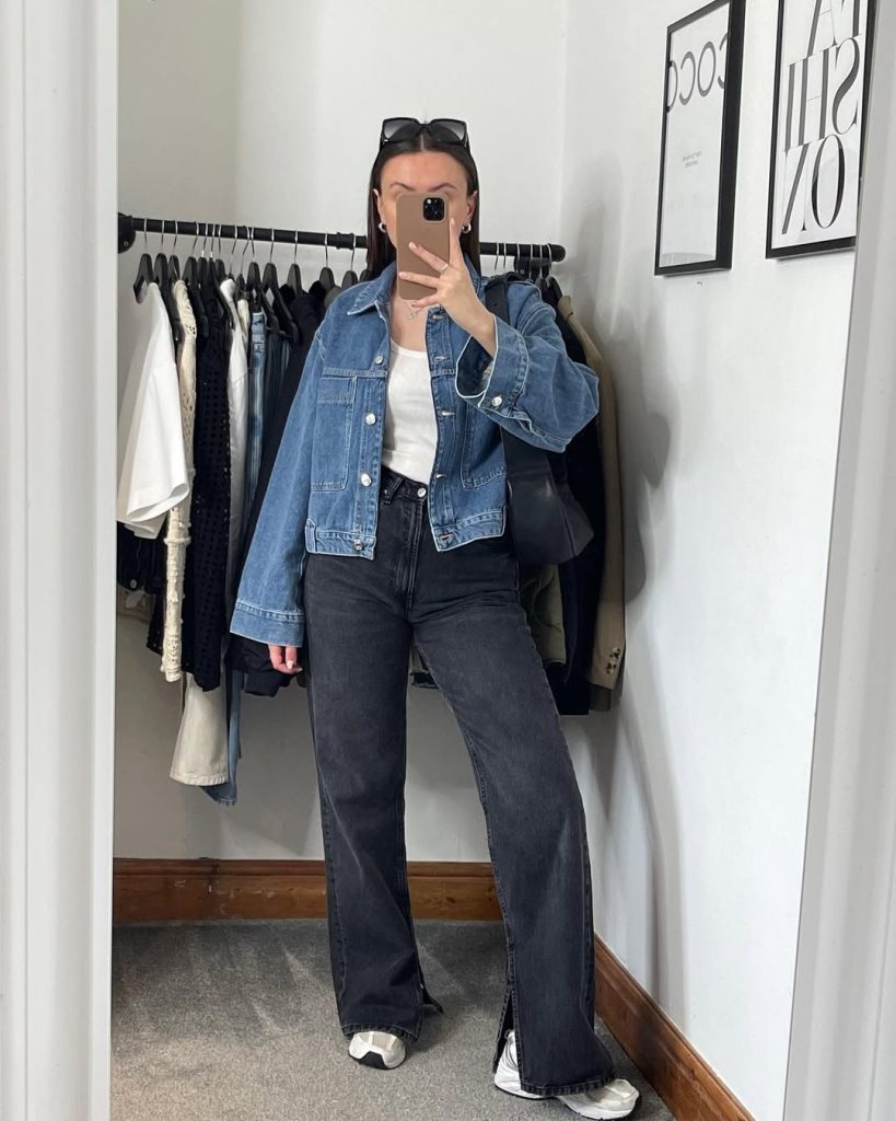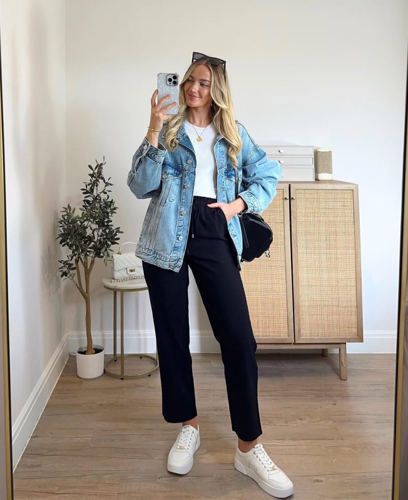 The denim jacket’s versatility shines when paired with sleek monochrome pieces—this pairing feels polished and modern.