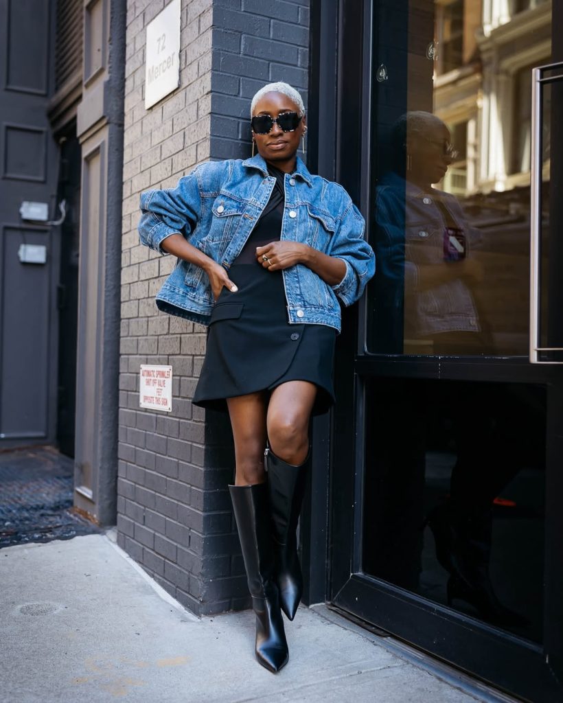 A fitted denim jacket pairs beautifully with a tan dress and tall black boots for a polished fall street-style moment.
