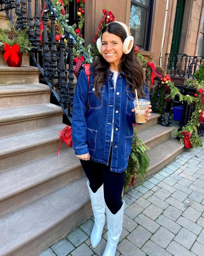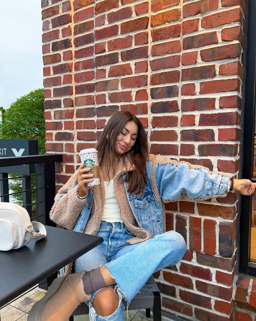 A sherpa-lined, two-tone denim jacket creates a layered winter look brimming with warmth, texture, and that irresistible coffee-shop coziness.