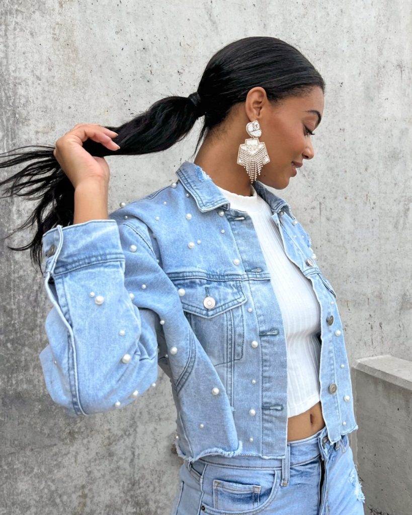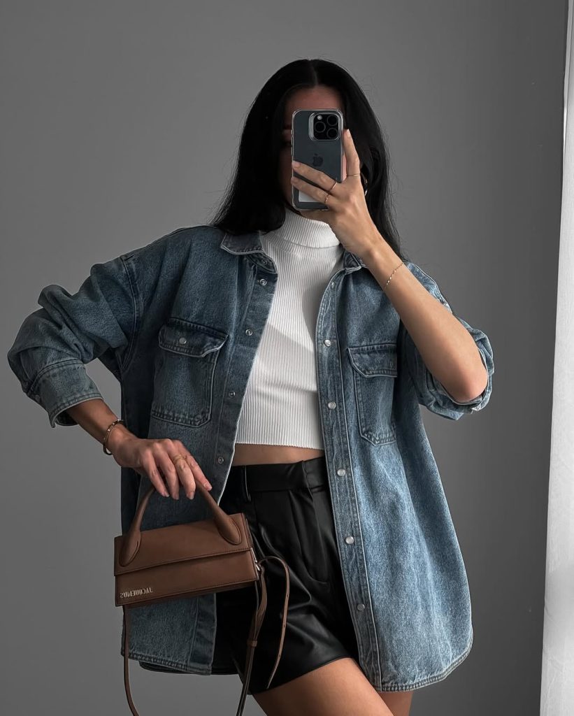 Great for the woman that wants to wear denim in a more playful way. This look is perfect for spring 2026 and is great for shopping, casual parties, or lunch dates. A white sneaker or platform sandal would balance the outfit. A pink or grey bag would be perfect to complete the fit. Make sure to skip oversized belts to avoid throwing the jacket off balance.