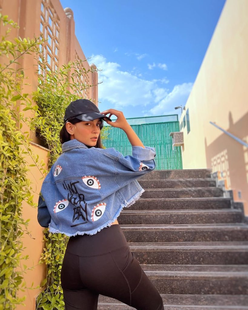 A cropped, graffiti-inspired denim jacket meets sleek leggings—urban, bold, and full of attitude for anyone who likes styling a statement piece.