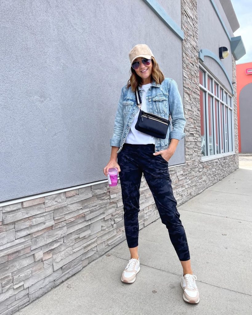 A fresh mix of light blue denim and dark camo joggers—easygoing yet structured, and perfect for women who love outfits that blur the line between sporty and chic.