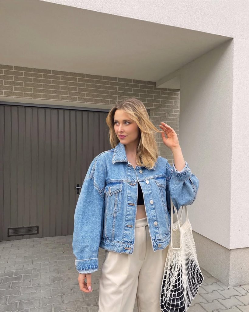 A timeless blue denim jacket paired with white trousers and neutral accessories creates a polished, everyday aesthetic.